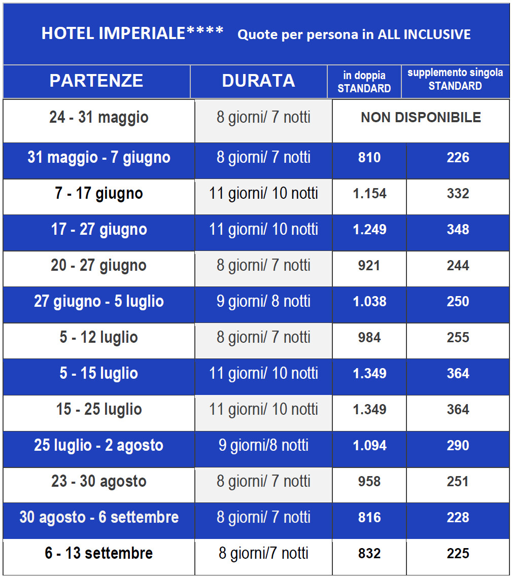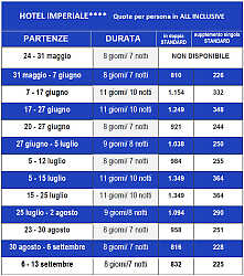 L’Hotel Imperiale 4**** vanta un’ottima posizione centrale, a pochi passi dalla spiaggia e dal centro di Milano Marittima; completamente climatizzato, dispone di piscina riscaldata con mini vasca circolare con acqua meno profonda, vasca idromassaggio in giardino, sala TV, bar, 2 ascensori, mini palestra, hammam (bagno turco con cromo e aroma terapia), wifi, noleggio gratuito biciclette.