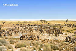 Immagini, immagini incerte, miraggi che lentamente si materializzano, in Namibia può accadere e, in particolare, nel Parco di Etosha, che in lingua Ovambo significa “il luogo dell’acqua asciutta”. Creato nel 1907, il Parco Etosha è uno dei primi parchi sorti per la protezione della fauna e della flora. Attualmente la riserva copre una superficie di 22.570 kmq, il cui centro è costituito dal "pan”, bacino perfettamente piano, lungo un centinaio di chilometri e largo una quarantina. Il pan era, nei tempi remoti, un lago collegato al sistema del fiume Kunene, ma ora è secco e la sua superficie di argilla e sale brilla alla luce del sole. Un parco diverso ed estremamente “fotogenico” sia per i paesaggi sia per la fauna e la flora: seguendo piste in terra battuta si va alla ricerca di gruppi di elefanti raccolti attorno alle pozze d'acqua, di branchi di erbivori in perenne movimento fra i boschetti di acacie, di giraffe, di felini. La scarsità dei bacini d'acqua rende necessario un curioso rispetto per la gerarchia degli animali che si abbeverano, in ordine di importanza: elefanti, predatori, erbivori e poi volatili. Ognuno aspetta impassibile il proprio turno, disponendosi a gruppo attorno alla pozza.