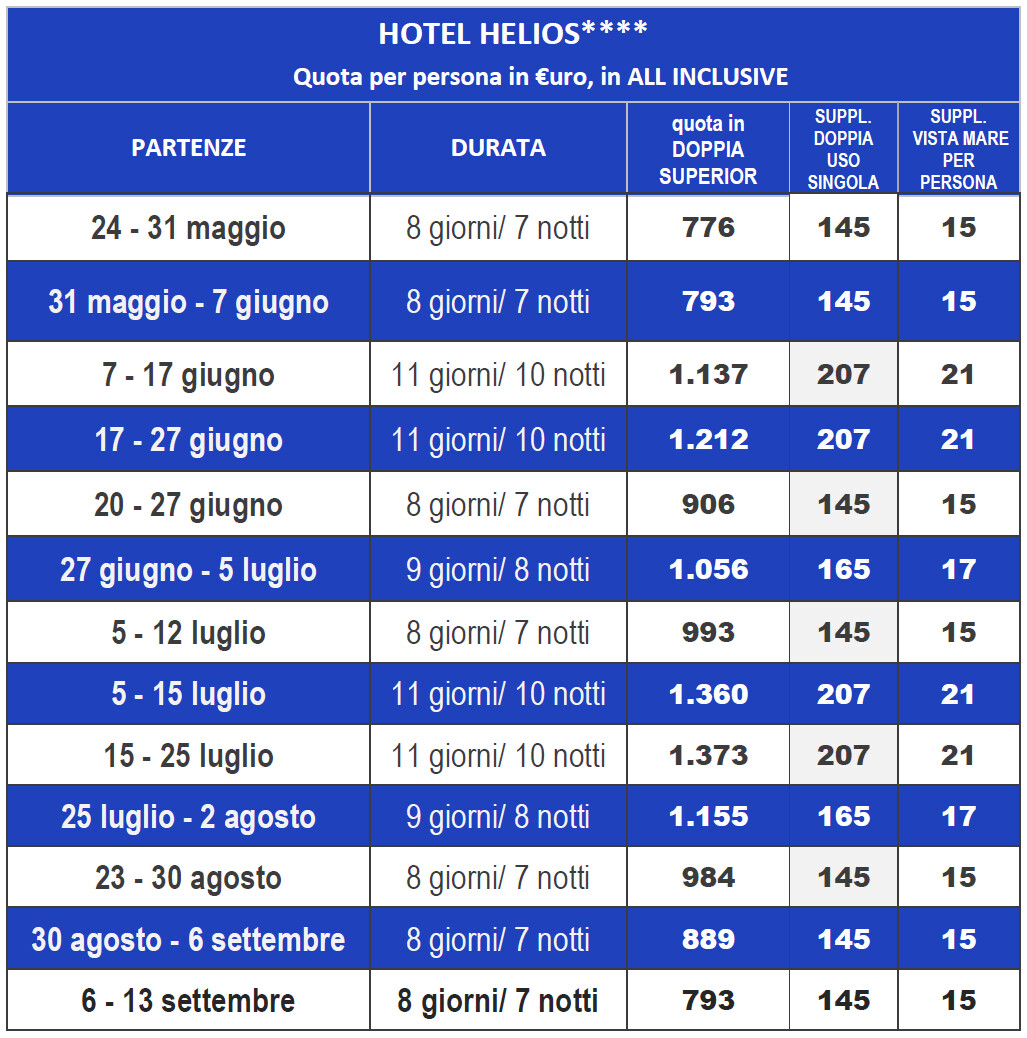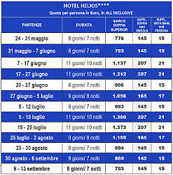 L’HOTEL HELIOS 4****, gestito direttamente dai proprietari, situato a pochi passi dalla spiaggia; è dotato di grande piscina riscaldata sopraelevata, con giochi d’acqua, trampolino, vasca idromassaggio, grande zona solarium con lettini: animazione quotidiana in hotel con lezioni di acquagym, acquaticità per bambini, gioco aperitivo e merende pomeridiane 2 volte a settimana; ambienti climatizzati, Wi-Fi gratuito in tutti gli ambienti, hall spaziosa con american bar e portineria aperta 24 ore su 24, 2 ascensori, ampia veranda panoramica; biciclette con seggiolini bimbo ad uso gratuito.