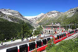 Il Trenino Rosso è un’opera di ingegneria senza eguali: un percorso ferroviario di circa 61 km che raggiunge i 2.253 m all’Ospizio Bernina, attraversa 13 gallerie/tunnel, 52 ponti/viadotti, raggiunge una pendenza del 7% con un sistema di scartamento ridotto che permette di affrontare curve a raggio minimo. Ma ciò che lo rende davvero unico è il paesaggio: la vista sul superbo massiccio del Bernina che spazia da Piz Lagalb alla Diavolezza, dal ghiacciaio del Morteratsch al Pizzo Palù.